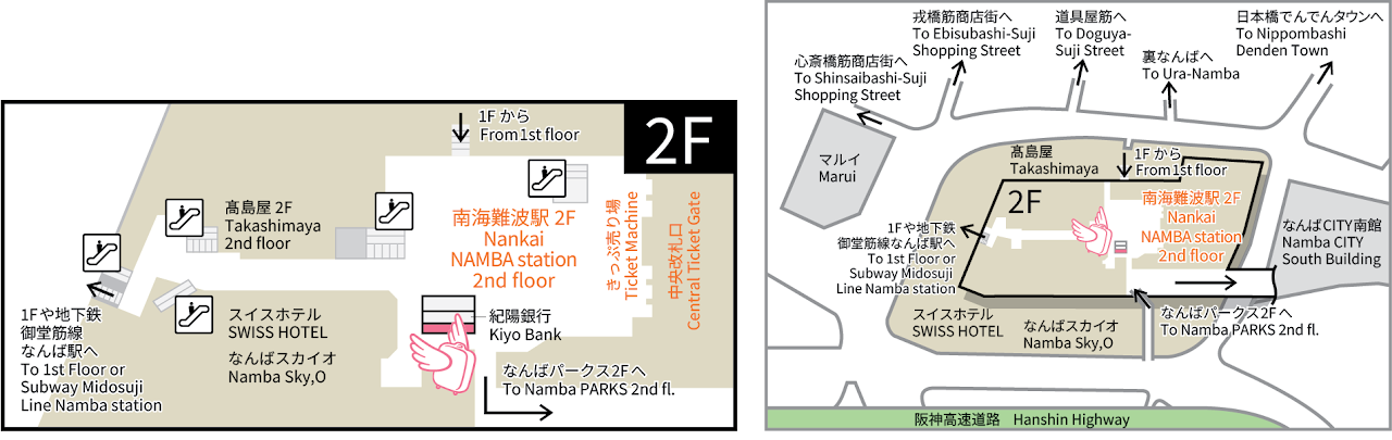 〒542-8503 大阪市中央区難波5-1-60 南海なんば駅2F 中央改札口前(改札外)